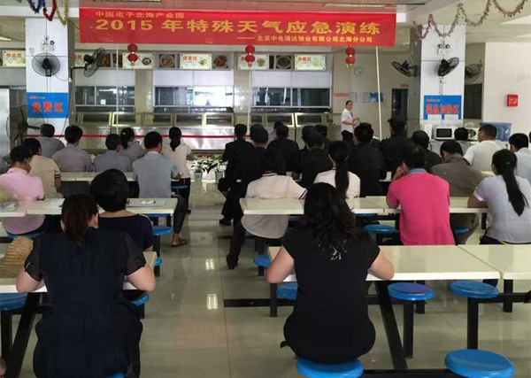 因北海天氣多變,特殊天氣隨時可能發(fā)生,為防止隨時可能出現(xiàn)的特殊天氣對園區(qū)安全帶來不利影響,確保園區(qū)設(shè)備財產(chǎn)的正常運轉(zhuǎn)、安全,確保園區(qū)安全生產(chǎn)零事故,同時為讓員工熟悉應(yīng)對特殊天氣的工作流程,做到工作有計劃性、準(zhǔn)備工作及時到位、突發(fā)事件處理及時,園區(qū)物業(yè)公司(中電瑞達(dá))于2015年6月9日下午,組織公司全體人員開展了一次特殊天氣應(yīng)急演練。整個演練分為:特殊天氣應(yīng)急預(yù)案培訓(xùn)、特殊天氣應(yīng)急演練兩大部分。為確保此次演練順利進(jìn)行,物業(yè)公司積極準(zhǔn)備,專門組織各部門負(fù)責(zé)人召開專題會議,完善方案、物資準(zhǔn)備,部署每個演練環(huán)節(jié),明確人員分工、時間節(jié)點、演練流程。