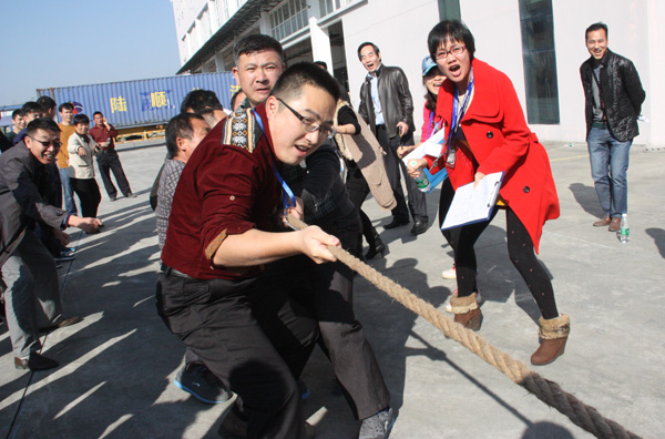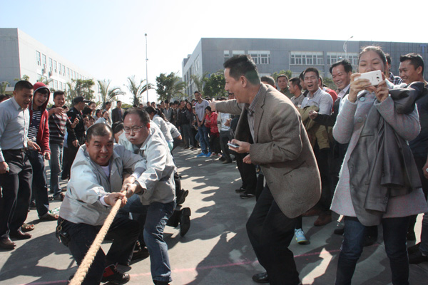 下午,一場別開生面的拔河比賽將活動推向小高潮。拔河比賽以促進(jìn)企業(yè)交流為宗旨,豐富職工體育活動為目的,為企業(yè)搭建展現(xiàn)集體風(fēng)采的舞臺,從而發(fā)揚(yáng)團(tuán)隊精神,增強(qiáng)凝聚力。此次比賽園區(qū)企業(yè)積極響應(yīng),共有11個企業(yè)組隊參加,特別是有些企業(yè)為了參賽,臨時停工,比賽結(jié)束后回單位繼續(xù)生產(chǎn),體現(xiàn)了園區(qū)大家庭的凝聚力。每支參賽隊伍共15人,其中男生10人,女生5人,實行淘汰制晉級方式。當(dāng)比賽哨聲響起,各參賽隊員們口中一起高呼“一二,一二”,雙手緊握長繩,憋足勁拼命往后拉,拉拉隊在旁助陣加油,恨不得抓起繩子跟隊員們一起努力,各種加油聲、吶喊聲此起彼伏,回響至整個園區(qū)。經(jīng)過激烈較量,最終冠捷科技獲得冠軍,瑞達(dá)物業(yè)獲得亞軍。