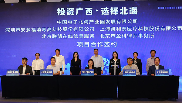 在北海市委書記蔡錦軍,市委常委、常務副市長譚秀洪,市委常委、秘書長鄭定雄,經(jīng)開區(qū)管委會主任劉忠廣,中國電子北海產(chǎn)業(yè)園公司執(zhí)行董事徐俊男,長江商學院老師徐汀、長江商學院老師許耀公的見證下,中國電子北海產(chǎn)業(yè)園發(fā)展有限公司與上海凱利泰醫(yī)療科技股份有限公司、北京聯(lián)儲在線信息服務有限公司、深圳市安多福消毒高科技股份有限公司、北京市盈科律師事務所簽署合作協(xié)議。